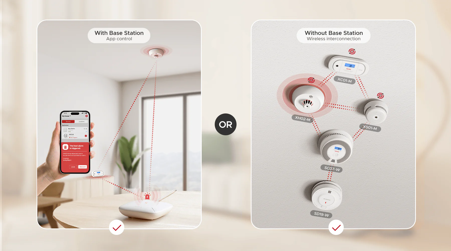 | Advanced Alarm System Link the X-Sense XH02-M with Link+ alarms for essential coverage or opt for advanced control by connecting up to 50 Link+ Pro devices via the SBS50 Base Station. Enjoy features like real-time alerts, remote testing, and silencing, plus device sharing—all accessible through your smartphone app. |