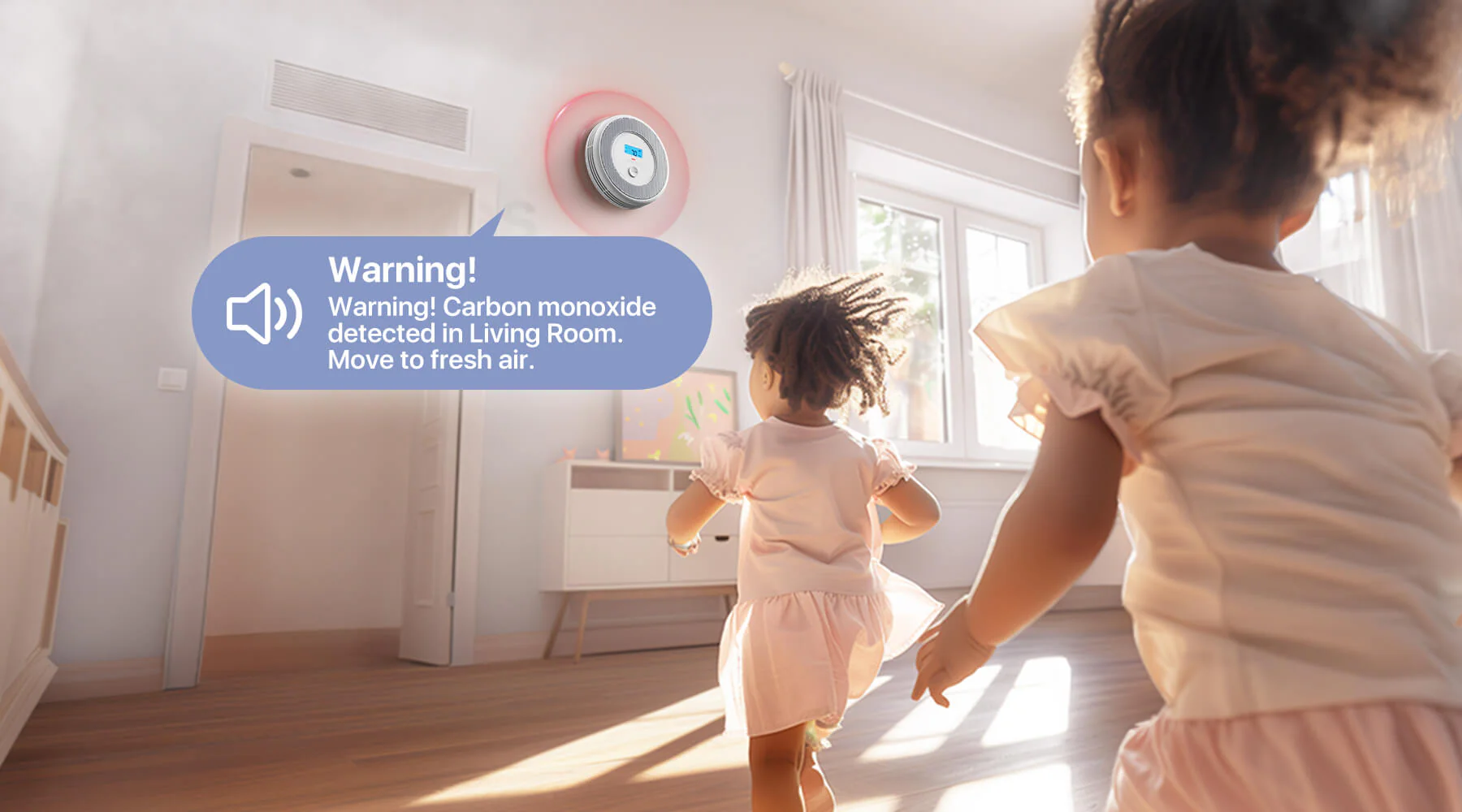 Real-Time Voice Alerts: Clear voice warnings, such as "Warning! Smoke detected in Living Room. Evacuate." or "Warning! Carbon monoxide detected in Basement. Move to fresh air."