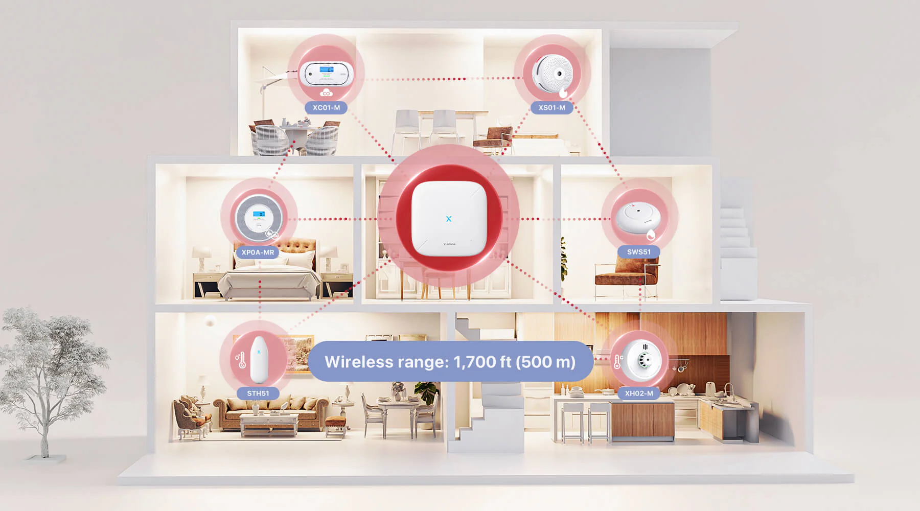 SBS50 Base Station Compatibility The SBS50 Base Station can connect with up to 50 X-Sense smart alarms, enabling centralized management of your safety network. And the XP0A-MR is capable of maintaining communication with the base station at distances up to 1,700 feet (500 meters) in open areas. This ensures effective connectivity across large properties or multi-story buildings, enhancing the reliability and reach of your safety network. |